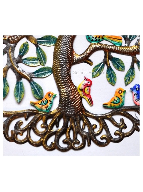 Arbre réalisé à partir de métal recyclé, découpé, martelé et peint par un artiste haïtien.